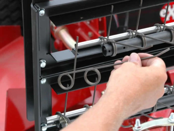- Heavy-duty 12 gauge powder coated steel rake deck is the backbone of the dethatcher.