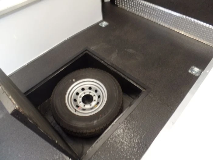 - spare wheel and tire compartment under floor with door access on inside of trailer in floor (near the rear)