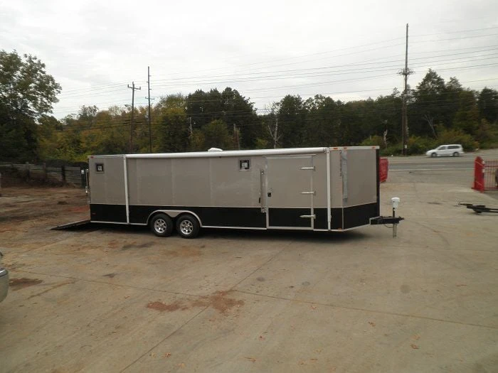 This is a custom enclosed trailer in beige measuring 8.5 ft by 26 ft and features vinyl interior, rubber floor, e-track, generator box and two 5,200 pound axles and brakes.Brands may vary based on stock. Similar specs are used across all brands.