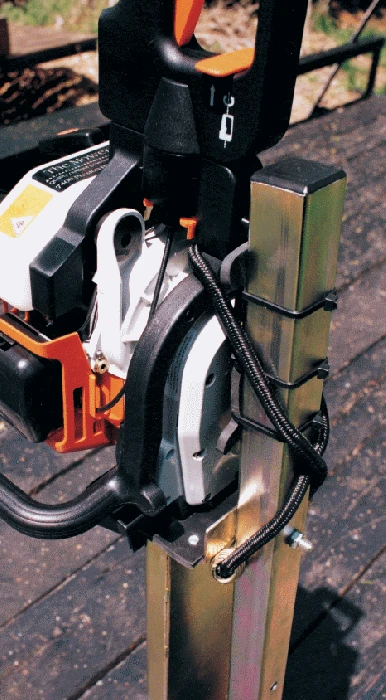 The HS-1 will secure and protect both single and double edge hedge trimmers of any length. The vertical position uses less trailer space and stores the trimmer up and out of the way, preventing damage. Trimmers with blades 24 inches and longer can be locked in place by simply attaching a standard padlock to the blade. A “thru hole” for a locking pin can be used to secure shorter blades.